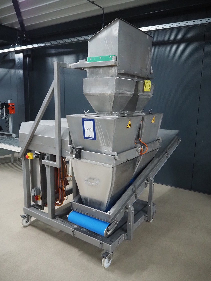 Multipond waga wielogłowa z 20 głowami, typ: MP 20-3800/1250-H, numer seryjny: M 2718, rok budowy: 2011, 416 V, 3 Ph, 50/60 Hz, maksymalna masa: 3000 gramów, minimalna waga: 50 gramów, e= 0,5 grama, d= 1,0 gram, T= 150 gramów, całkowite wymiary: 2600 mm x 2200 mm x 1300 mm. Nogi pokazane na nagraniu nie są dołączone.