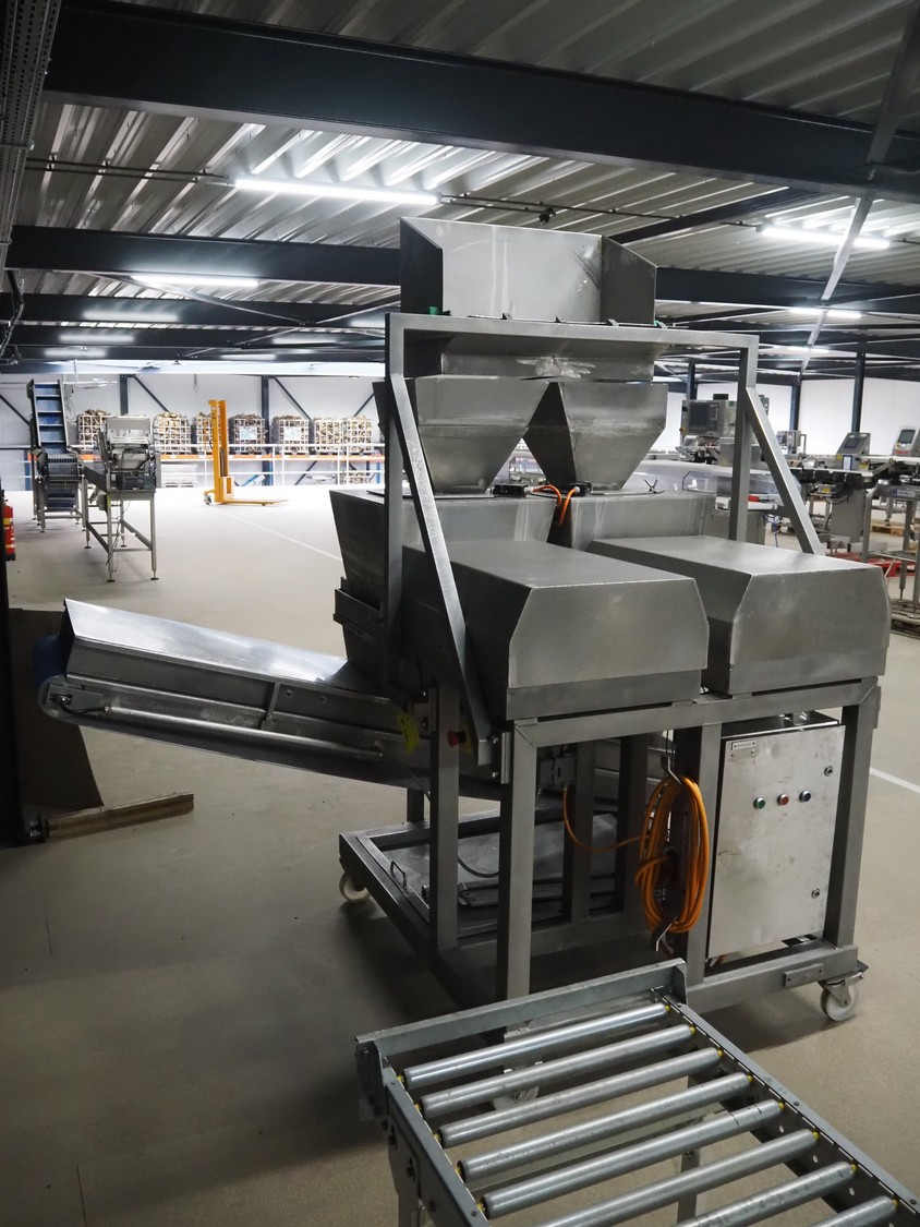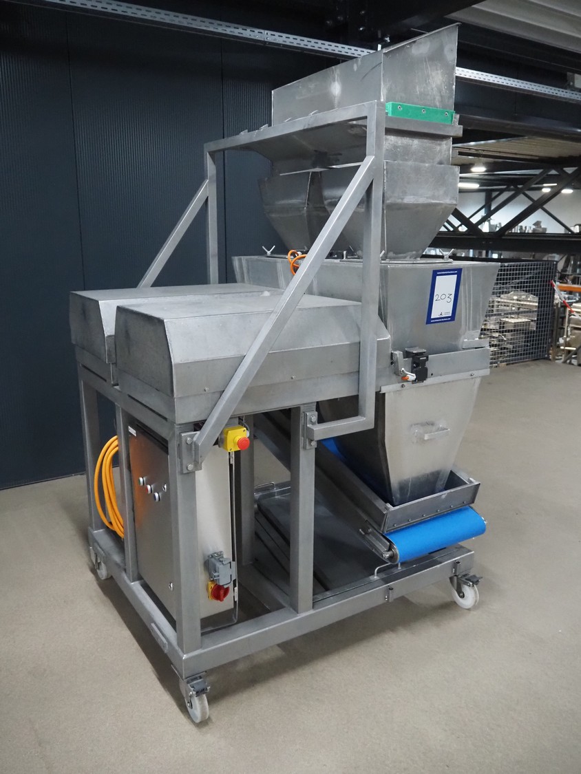 Mobilna podwójna tartka, prześwit wejściowy: (2x) 720 mm x 340 mm, plastikowy pas wyprowadzający, szerokość taśmy: 450 mm, wysokość podnoszenia: 980 mm, całkowite wymiary: 1370 mm x 2050 mm x 2300 mm.
