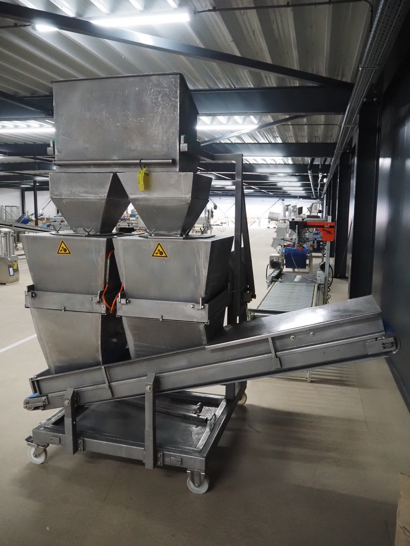 Sekacza Weber z paskiem kontrolnym i odrzucającym, typ krojaczki: MCS 902, numer: 2625, rok produkcji: 07/2006, 400 V, 50 Hz, 10 kW, 6 belek, plastikowy pasek wylotowy, szerokość taśmy: 400 mm, wymiary całkowite: 3150 mm x 1700 mm x 2600 mm. ważarka kontrolna: CCW, numer: 2625, rok produkcji: 07/2006, plastikowy pasek przewodowy, szerokość taśmy: 480 mm, wymiary wagi kontrolnej: 750 mm x 500 mm x 1150 mm.