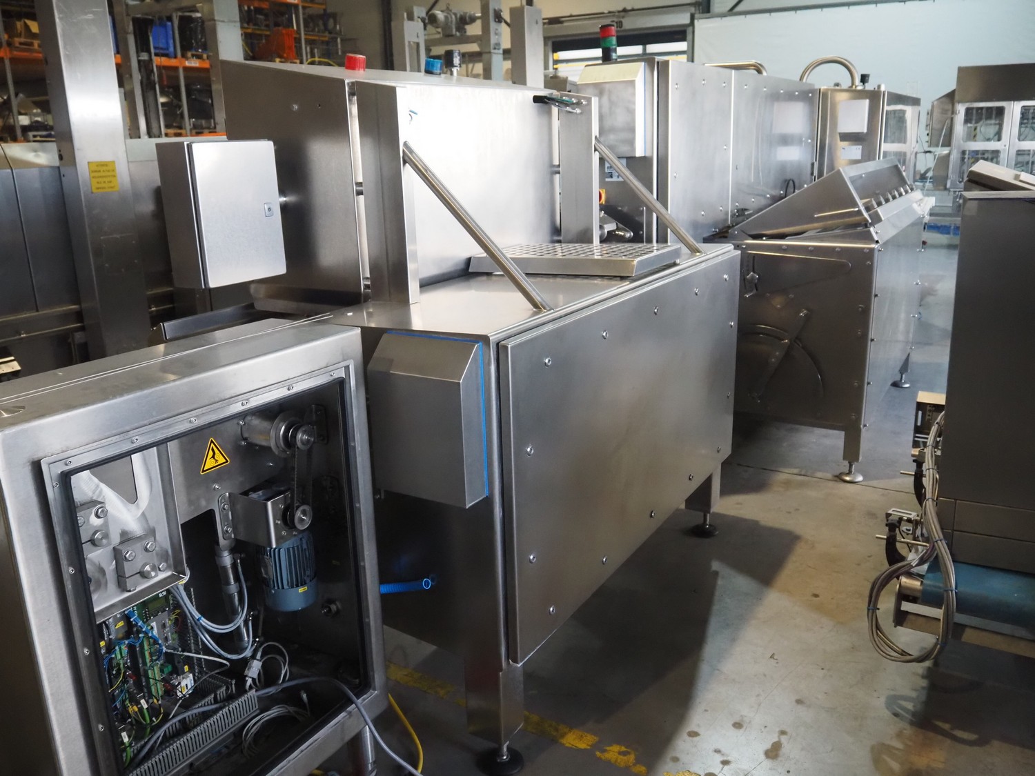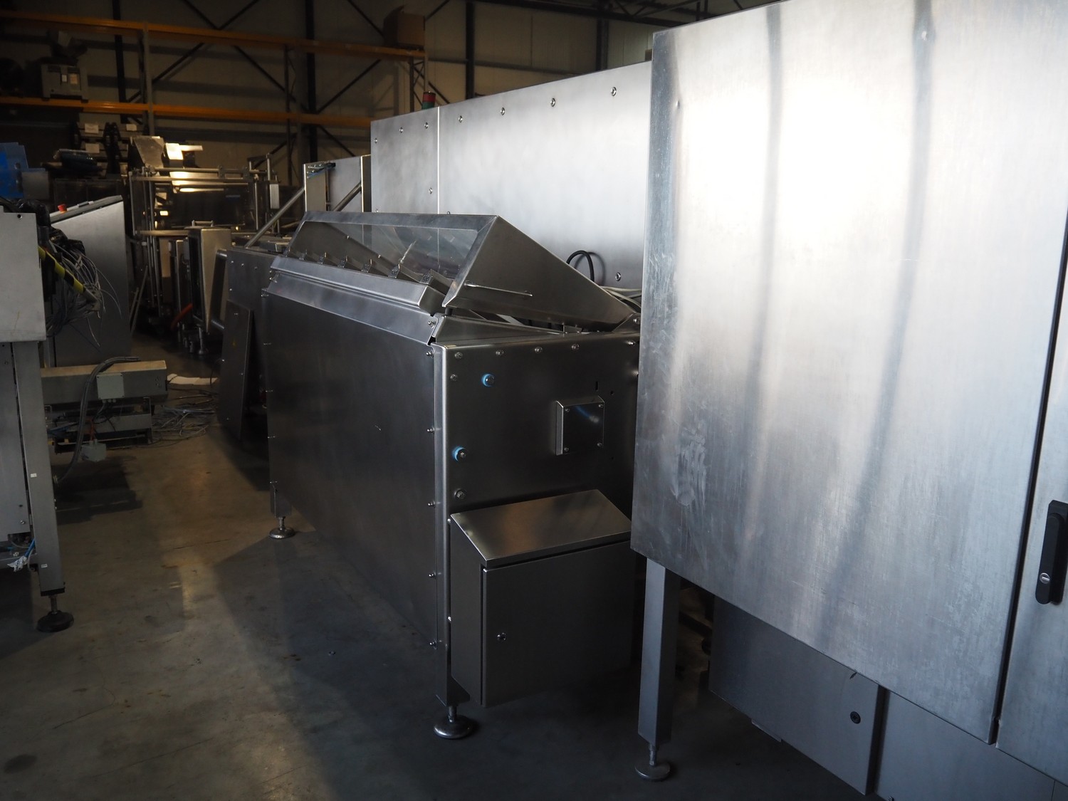 Systemy automatyzacji wyciągają taśmę włogowe do flowpackera, typ: DNT101, rok budowy: 2015, 400 V, 3 Ph, 18 A, 7 kW, plastikowa taśma, szerokość taśmy: 190 mm, 405 i 50 mm, wymiary tacek: 175 mm x 125 mm, odległość między przegrodami: 245 mm, całkowite wymiary: 5750 mm x 2000 mm x 2150 mm.
