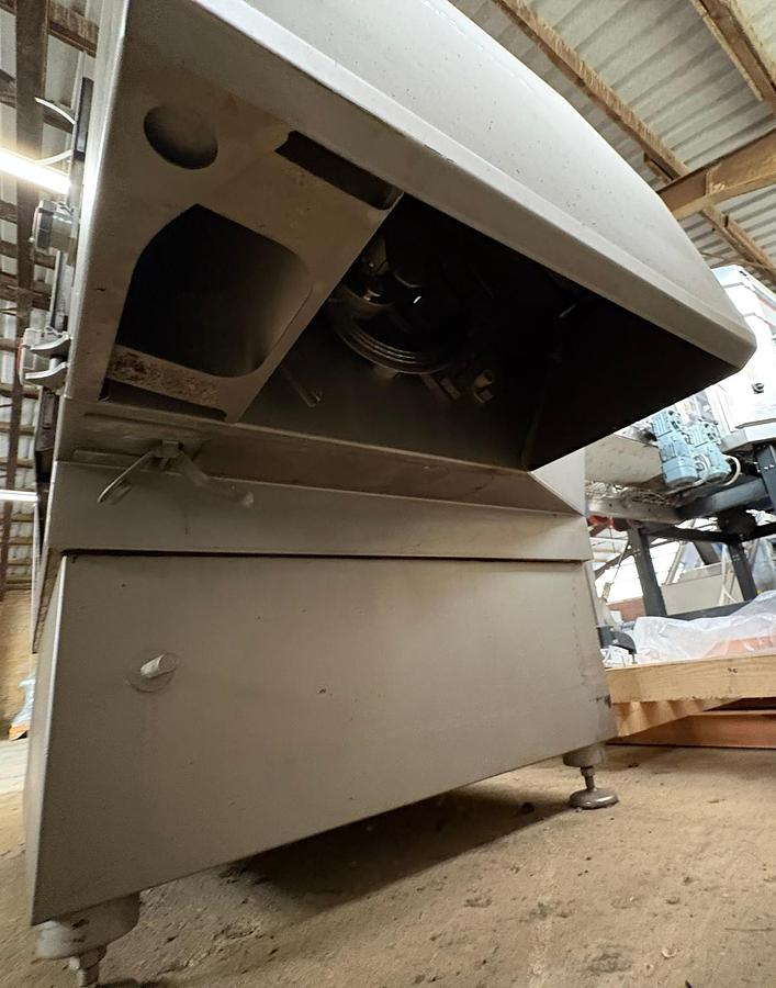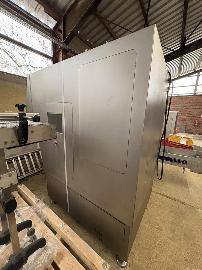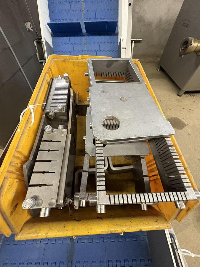 Rühle SR3 cube and strip cutter (built in 2013), The Rühle SR3 is a fully automatic high-performance cube and strip cutter for industrial use in food processing. The machine stands out with precise cut quality, high throughput, and maximum flexibility for a wide range of products., Whether meat, bacon, cheese, fruit or vegetables – the SR3 processes almost all common raw materials reliably and evenly into cubes, strips or slices., Due to automatic loading, modern control technology, and quick-change system for cutting gates, the machine is ideal for use in production lines with high requirements for efficiency and product quality., Highlights, - Fully automatic high-performance machine, - Universally usable (meat, cheese, vegetables, fruit), - Precise cut images with minimal fracture proportion, - Quick-change system for cutting fences, - Touch control for simple operation, - Mobile discharge belt integrated, Technical specifications, - Power: up to about 3.500 kg/h, - Cut lengths: approx. 0.5 – 32 mm, - Cutting performance: up to 320 cuts/min, - Cutting temperature: approx. -5 °C to +80 °C, - Connection: 400 V / 3 Ph / 50 Hz, - Power: approx. 17 kW, - Chamber size: approx. 120 x 120 mm, - with 6 cutting units (6, 8, 10 and 24 mm), Feeding belt with separators, plastic mesh belt, belt width: 500 mm, edge height: 100 mm, distance between edges: 290 mm, conveying height: 2520 mm, overall dimensions (belt): 3300 mm x 1200 mm x 2620 mm., Dimensions / weight: Lx B xH: approx. 1300 x 2200 x 2820 mm