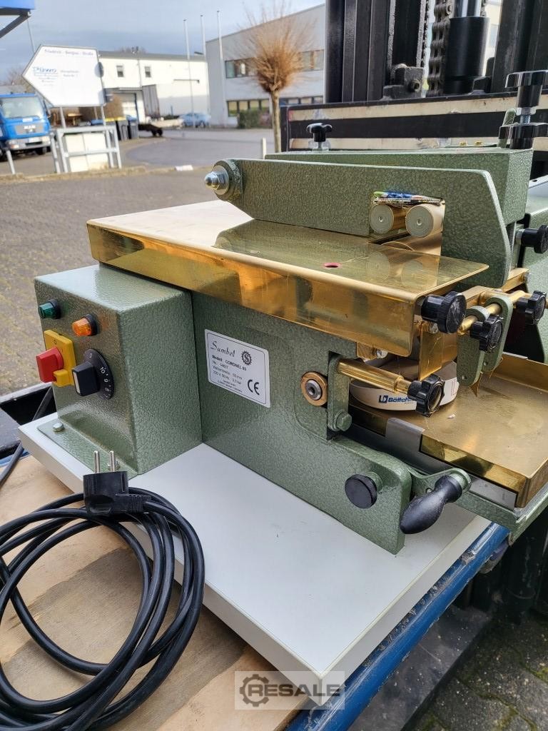 Maszyna opanowańska Sumbel Coronel 60; Stan jak nowy; Szerokość robocza 60 mm; odpowiedni do kleju na gorąco i na zimno; Urządzenie stołowe.