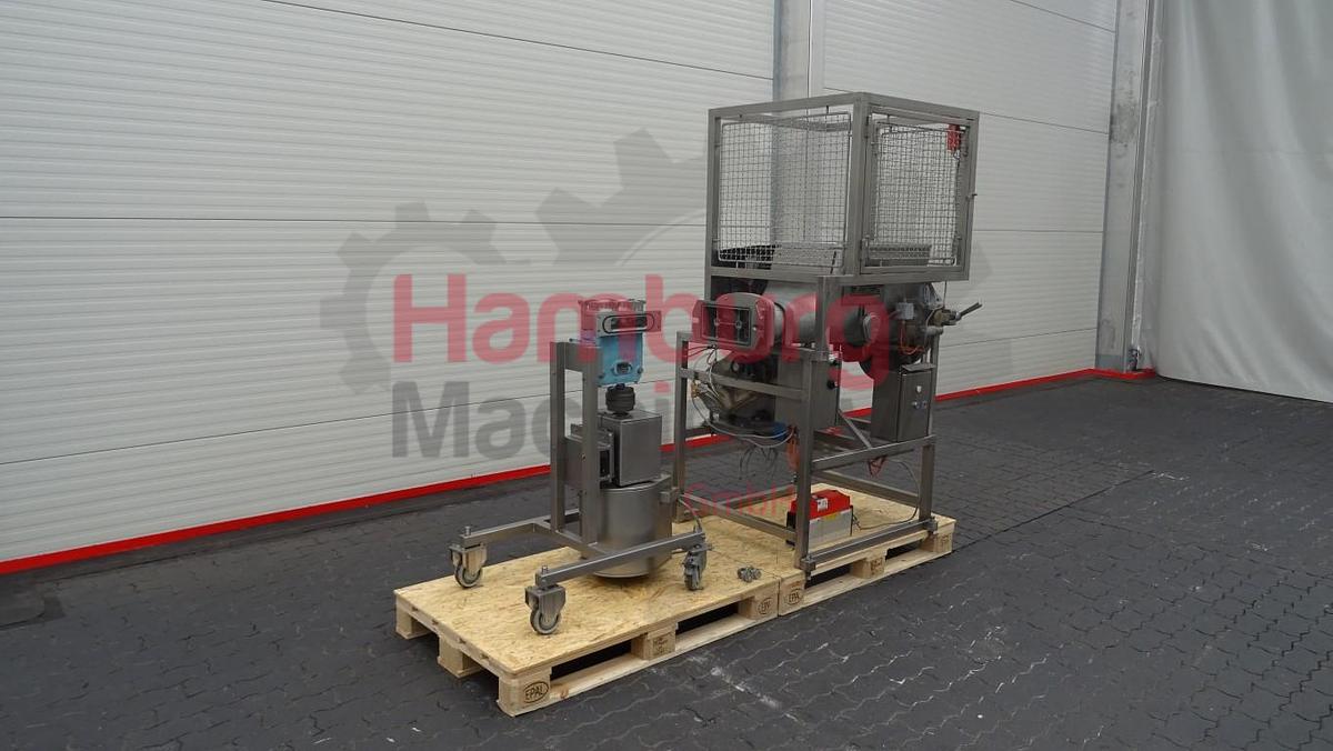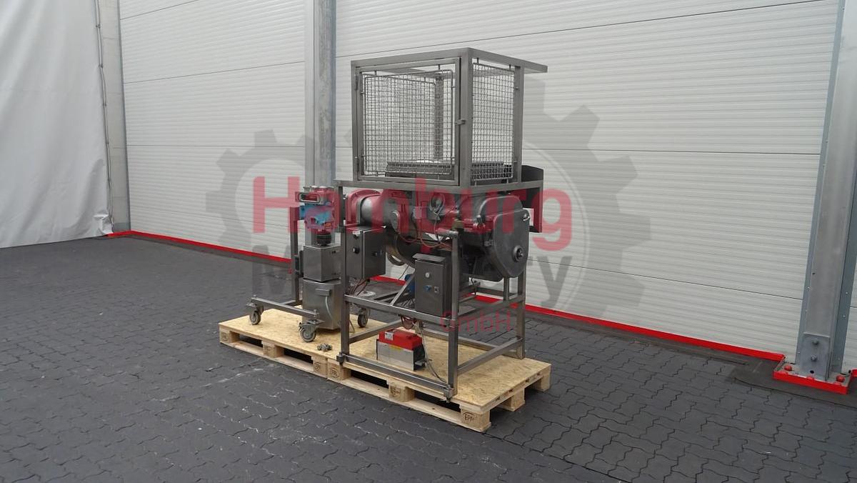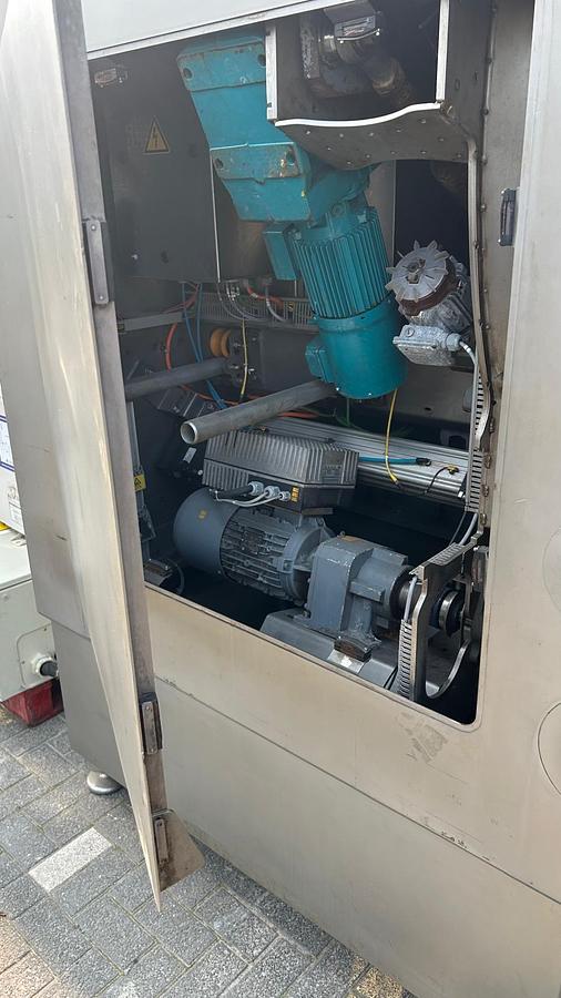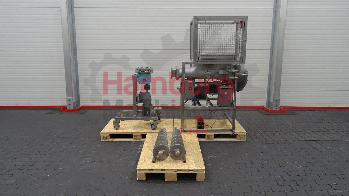 Przecinarka próżniowa Kramer+Perkoz VSM 200 Producent Niemcy Rok produkcji Remontowane Dane techniczne wymiary gabarytowe 2800x2300x1700 mm; miska 200 ltr; 3 prędkości noży 1000/1500/3000 obr./min; 2 prędkości bębna; 2 prędkości mieszania; ładowarka hydrauliczna; rozładowarka hydrauliczna; 6 noży; zasilanie 400 V, 50 Hz; moc: silnik główny 26/48/85 kW, silnik bębnowy 2,6/5,1 kW, silnik mieszający 3,2/4,1 kW; silnik rozładowania 1,1 kW, układ hydrauliczny 2,2 kW, pompa próżniowa Busch 250 m3, 5,5 kW.
