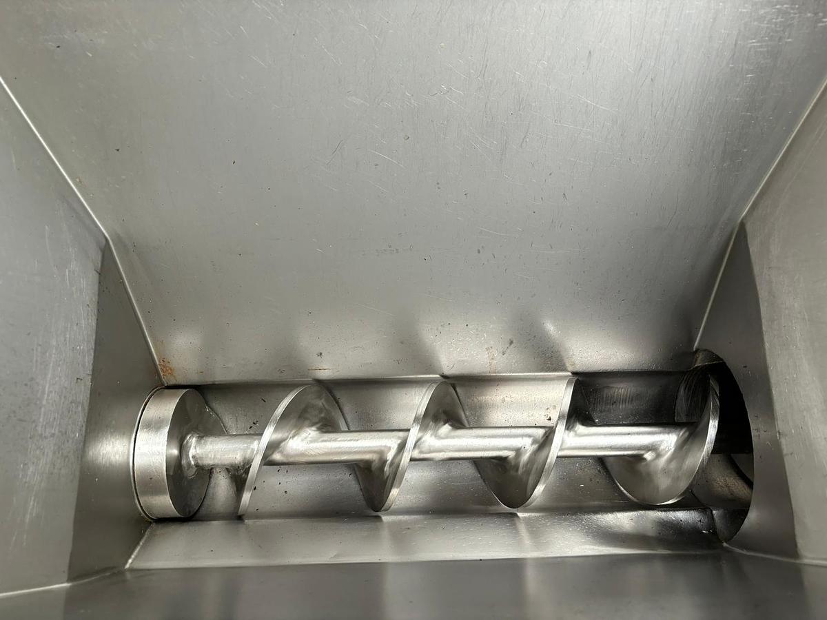 Skid mounted aluminium Benhil through with augers with drivework for the augers, small control panel with controls, fench protection above the through with augers for safe working and mobile outfeed Waukesha 034 lobe pump with motor ( ± 5,5 kW, estimated no name tag) and motorcover. Pump displacement per revolution: 0,227 liter. Pump maximum nominal capacity: 5.500 ltr/h. Pump inlet, rectangular, 1,75 x 6,75 / 44,5 mm x 171,5 mm and outlet, round, 2 / 50,4 mm. Pump maximum pressure range: 200 psi / 13,8 bar. Pump max speed: 400 rpm., Type of Machine: Through with augers with butterpump, Motor lobe pump: +/- 5,5 kW - 380 V - 50 Hz, Total dimensions: 120 x 120 x 210 cm, Weight: 200 kg