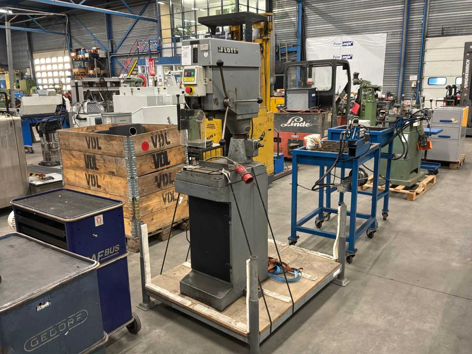 Equipped with: Otto Müller, SR30 Fast Radial drilling machine, drill spindle holder (morse): 40mm, longitudinal travel drill chuck (X-axis): 750 mm, height travel arm (Y-axis): 450 mm, spindle diameter: 70 mm, max drilling depth: 150 mm, speed: 2400 rpm, dimensions: 175x120x235cm (LxWxH), power supply: 380v, 2-speed motor (approx. 650 / 2780 rpm), mechanically switched speed, radially adjustable arm, vertical arm adjustment along column, m spindle with manual feed, refrigeration system, solid cast iron work table with T-slots