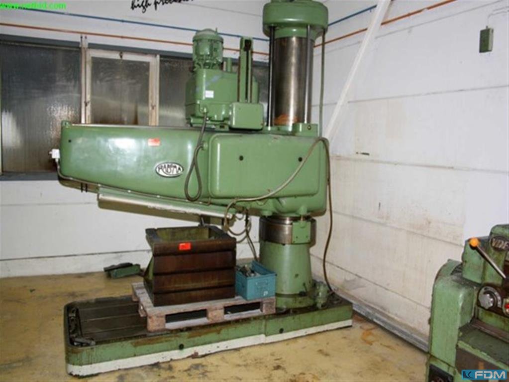 Producent: RABOMA Modelu: 12Rh1600 Rok produkcji: 1957 Typ maszyny: Wiertarka promieniowa Specyfikacja techniczna: - Max. Wydajność wiercenia (materiał pełny): 75 mm - Średnica wrzeciona: 114 mm - Stożek wrzeciona: MK 5 - Przesuw wrzeciona: 500 mm - Moc napędu: 7,5 kW - Zakres prędkości: 14 – 1 400 obr./min Wymiary stołu roboczego: - Powierzchnia górna: 750 × 1 000 mm - Powierzchnia boczna: 530 × 1 000 mm - Płyta podstawy: 1.000 × 1.600 mm Regulacje i ruchy: - Regulacja wysięgnika: - Pionowo: 1 000 mm - Poziomo: 950 mm (zamykany na klucz) - Regulacja suwaka wiertła: - Poziomo: 1 000 mm - Zakres obrotu wysięgnika: