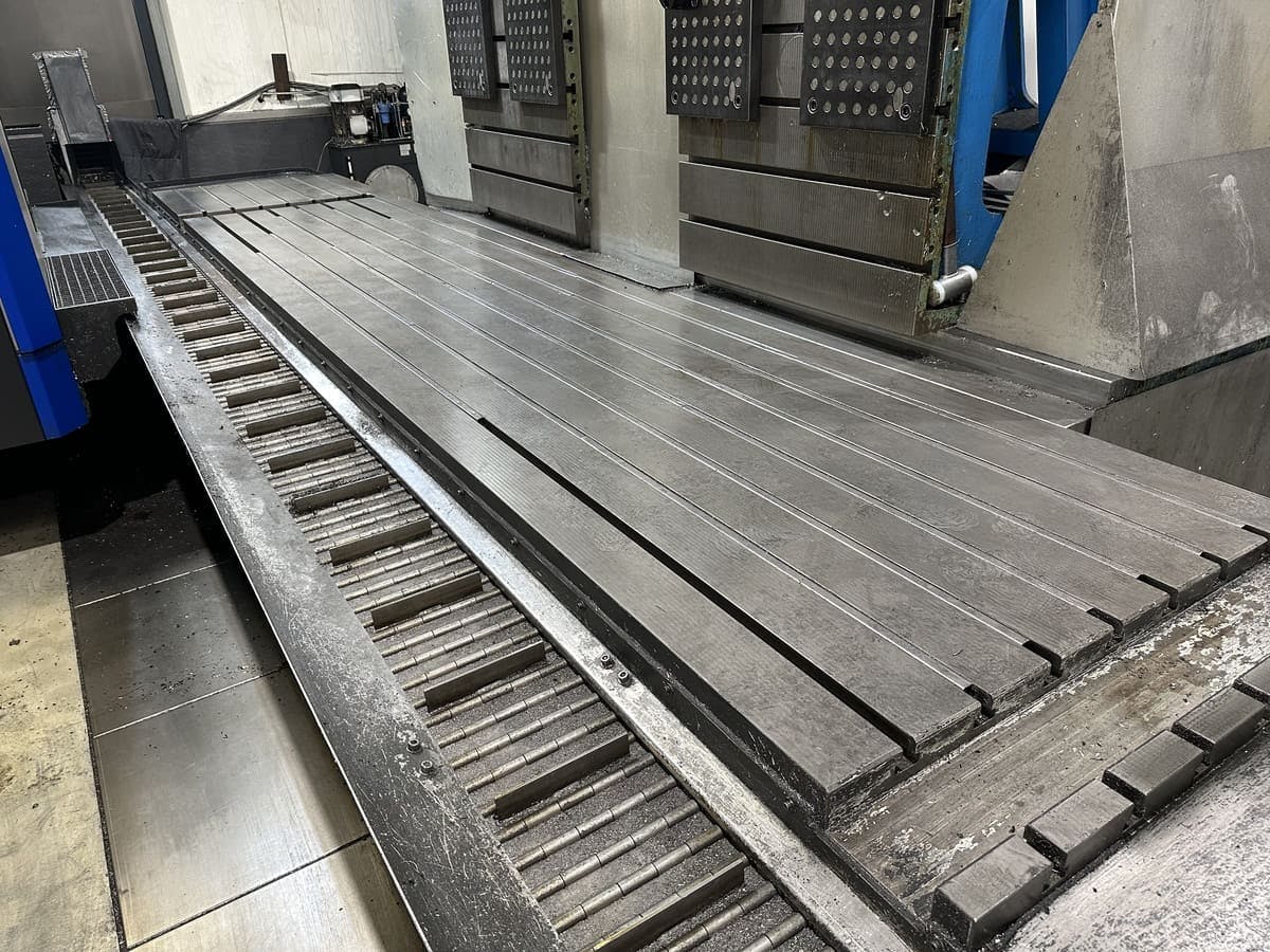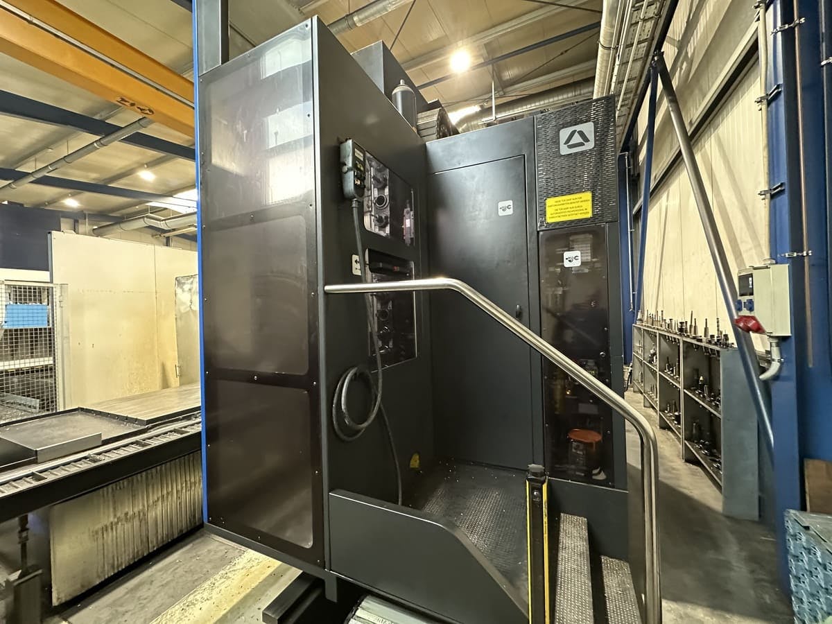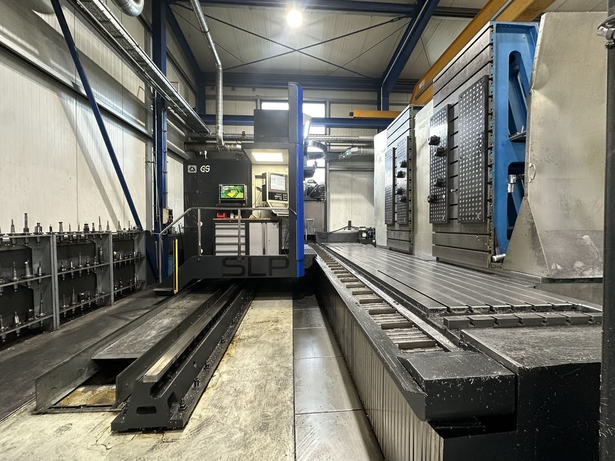 Soraluce SLP-6000Year of manuf. : 2017 Control : Heidenhain TNC 640 Speed : 5000 rpmMovement X/Y/Z : 4500/1800/1300 mm____________Description:In General:Year of manufacture:2017Control system:Heidenhain TNC 640Travel range X/Y/Z:4,500/1,800/1,300 mmSpindle speed:5,000 rpmTool holder:SK 50Milling head (spindle):Technology:Diagonal head with gear spindleIndex:0.001°Speed:5,000 rpmTool holder:SK 50Max. power:43 kWMax. torque:1,045 NmCoolant supply:Coolant + blast airWorking table:Clamping surface:6,000 x 1,100 mmT-slots:6 x 22H12, spacing 140 mmTool magazin:Technology:Chain magazineNumber of stations:40Tool changer:Double gripper (horizontal/vertical)Max. tool diameter:125 (250) mmMax. tool length:400 mmEquipment:Position measurement systems:Direct scalesChip removal:Chip conveyorCoolant supply:Internal coolant system with filter, 20 barWorkpiece measurement:Funk M&H probeSet-up op ...