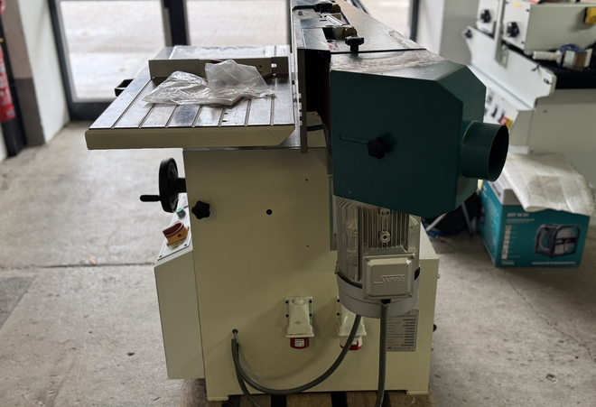 Frez do nacinania Wegoma Rodzaj: AKF 125 do frezowania profili z tworzyw sztucznych i aluminium z obustronnym ogranicznikiem profilu 60 Pneumatyczne urządzenie mocujące Posuw ręczny z dźwignią ręczną trójfazowego silnika frezującego Uruchamianie silnika bezpośrednio za pomocą dźwigni ręcznej Dysza ssąca o średnicy 100 mm biegnąca na wózku frezującym Ogranicznik profilu regulowany bez użycia narzędzi ze śrubą blokującą do 90 i 45 po obu stronach Moc silnika frezującego 1,5 kW Prędkość obrotowa silnika frezującego 2800 obr./min Ścieżka frezowania max 380 mm Średnica/wysokość frezu max. 210 mm/ 90 mm Średnica wrzeciona frezarskiego 27 mm Wymiary: dł. 700 mm x szer. 500 mm x wys. 700 mm Waga ok. 50 kg