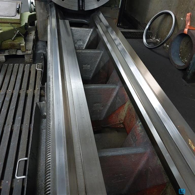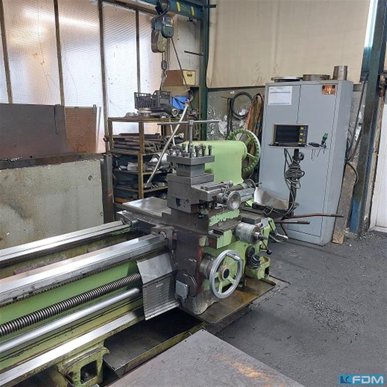 turning diameter over bed:1000 mm turning diameter over slide rest:745 mm turning length:3000 mm turning speed range:4,5 - 900 U/min spindle bore:110 mm max. workpiece weight between centres:12500 kg total power requirement:30 kW weight of the machine ca.:9 t dimensions of the machine ca.:5,2 x 2,3 x 2 m 3-axes digital readout rapid feed, feed at upper support 350 mm 1 fixed steady face plate diameter 1000 mm coolant attachment